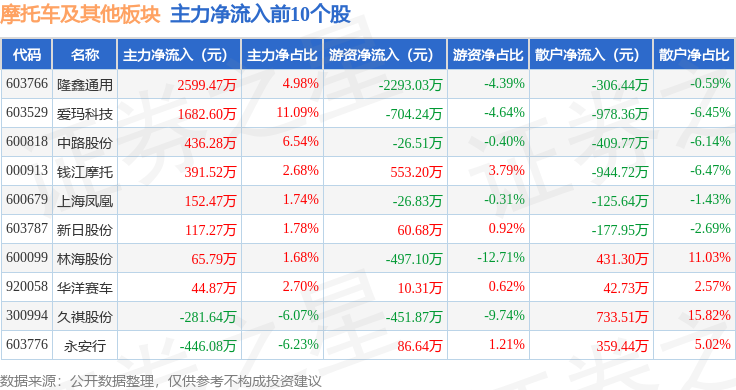 从资金流向上来看,当日摩托车及其他板块主力资金净流出4163.6万元,游资资金净流出7992.66万元,散户资金净流入1.22亿元。摩托车及其他板块个股资金流向见下表: