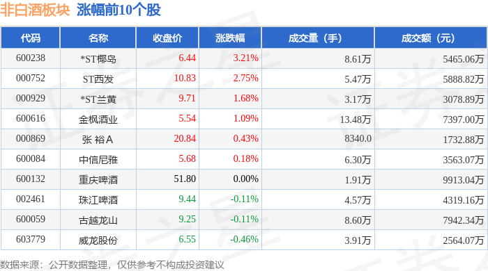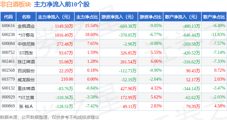 从资金流向上来看,当日非白酒板块主力资金净流出501.98万元,游资资金净流出1070.32万元,散户资金净流入1572.3万元。非白酒板块个股资金流向见下表: