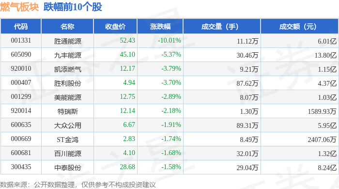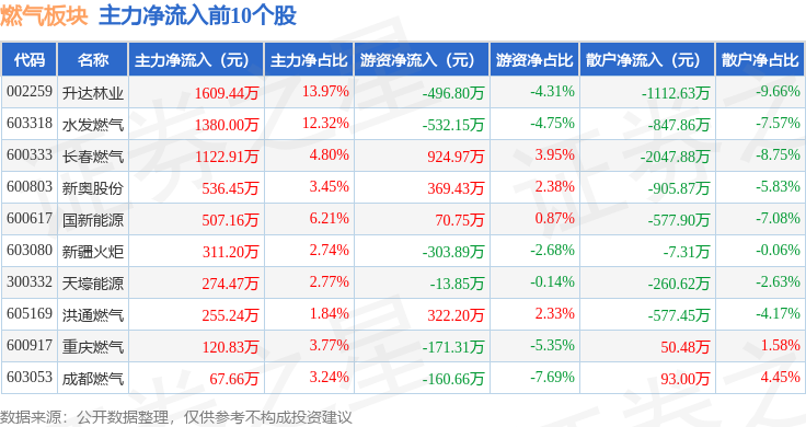 从资金流向上来看,当日燃气板块主力资金净流出3.42亿元,游资资金净流入1779.65万元,散户资金净流入3.24亿元。燃气板块个股资金流向见下表: