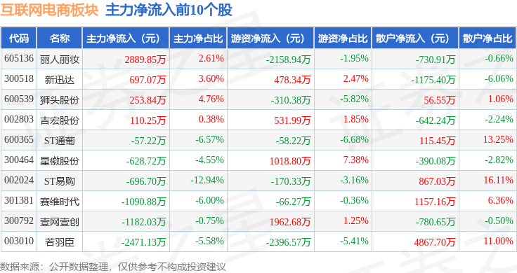 从资金流向上来看,当日互联网电商板块主力资金净流出7.9亿元,游资资金净流入3.23亿元,散户资金净流入4.68亿元。互联网电商板块个股资金流向见下表: