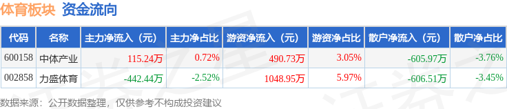 从资金流向上来看,当日体育板块主力资金净流出327.2万元,游资资金净流入1539.68万元,散户资金净流出1212.47万元。体育板块个股资金流向见下表: