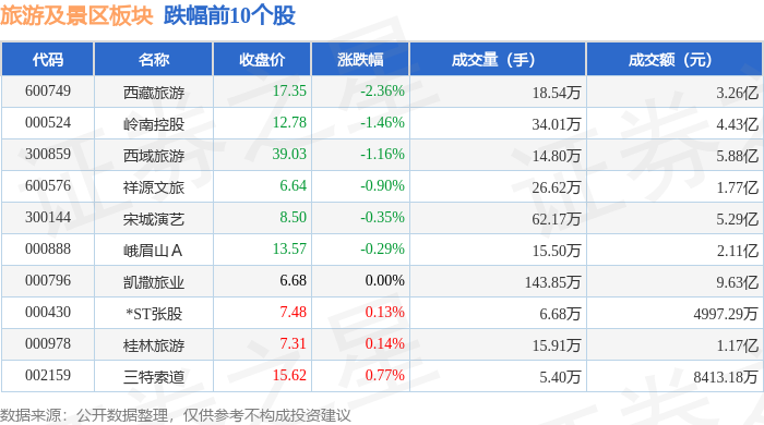 从资金流向上来看,当日旅游及景区板块主力资金净流入6.6亿元,游资资金净流出2.46亿元,散户资金净流出4.14亿元。旅游及景区板块个股资金流向见下表: