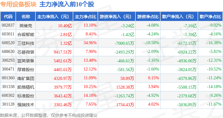 从资金流向上来看,当日专用设备板块主力资金净流出9.54亿元,游资资金净流出1.8亿元,散户资金净流入11.34亿元。专用设备板块个股资金流向见下表: