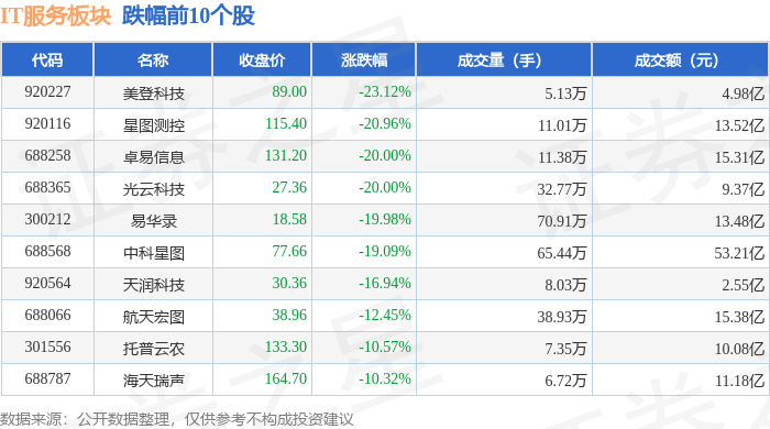 证券之星消息,1月15日IT服务板块较上一交易日下跌3.71%,美登科技领跌。当日上证指数报收于4112.6,下跌0.33%。深证成指报收于14306.73,上涨0.41%。IT服务板块个股涨跌见下表: