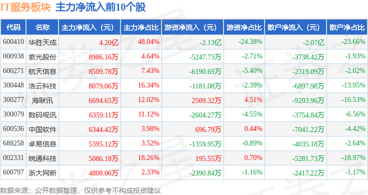 从资金流向上来看,当日IT服务板块主力资金净流出81.96亿元,游资资金净流入21.87亿元,散户资金净流入60.09亿元。IT服务板块个股资金流向见下表: