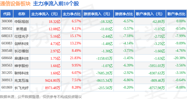 从资金流向上来看,当日通信设备板块主力资金净流出10.58亿元,游资资金净流出22.8亿元,散户资金净流入33.38亿元。通信设备板块个股资金流向见下表: