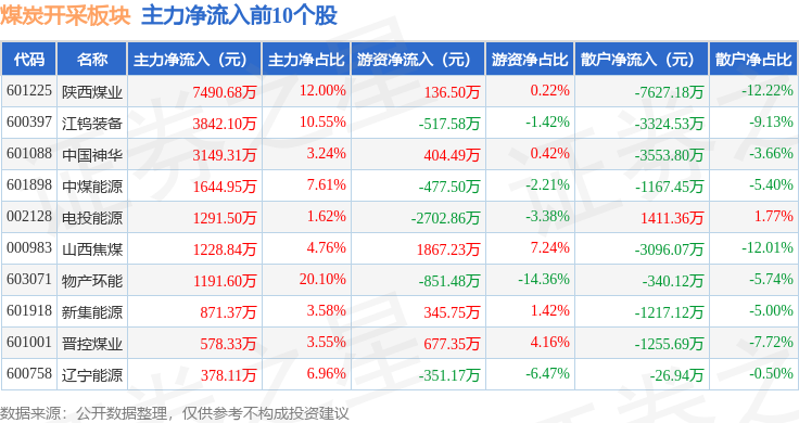 从资金流向上来看,当日煤炭开采板块主力资金净流出7961.42万元,游资资金净流入1.38亿元,散户资金净流出5860.75万元。煤炭开采板块个股资金流向见下表: