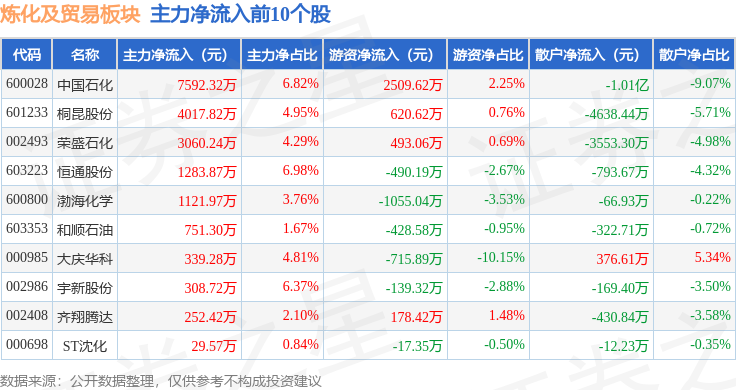 从资金流向上来看,当日炼化及贸易板块主力资金净流出2.86亿元,游资资金净流入2.38亿元,散户资金净流入4873.07万元。炼化及贸易板块个股资金流向见下表: