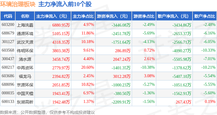 从资金流向上来看,当日环境治理板块主力资金净流出4.62亿元,游资资金净流入2.63亿元,散户资金净流入1.99亿元。环境治理板块个股资金流向见下表: