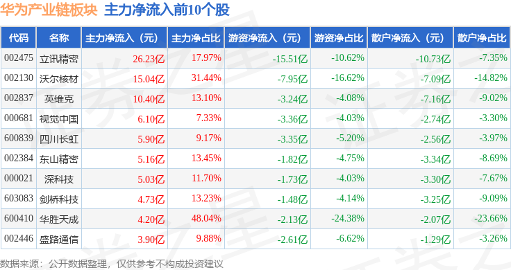 从资金流向上来看,当日华为产业链板块主力资金净流出135.07亿元,游资资金净流出8.62亿元,散户资金净流入143.69亿元。华为产业链板块个股资金流向见下表: