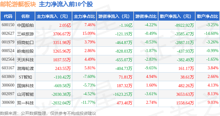 从资金流向上来看,当日邮轮游艇板块主力资金净流出2.25亿元,游资资金净流出1.81亿元,散户资金净流入4.06亿元。邮轮游艇板块个股资金流向见下表: