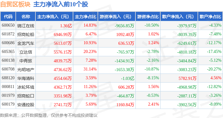 从资金流向上来看,当日自贸区板块主力资金净流出57.52亿元,游资资金净流入2.82亿元,散户资金净流入54.7亿元。自贸区板块个股资金流向见下表: