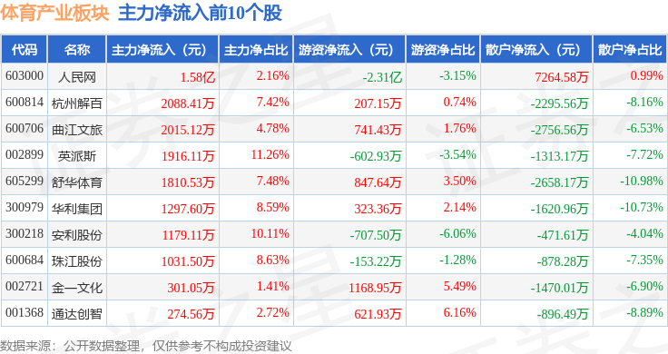 从资金流向上来看,当日体育产业板块主力资金净流出16.1亿元,游资资金净流出3.0亿元,散户资金净流入19.1亿元。体育产业板块个股资金流向见下表: