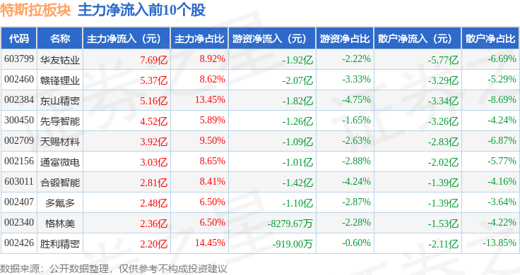 从资金流向上来看,当日特斯拉板块主力资金净流出9963.16万元,游资资金净流出13.3亿元,散户资金净流入14.3亿元。特斯拉板块个股资金流向见下表: