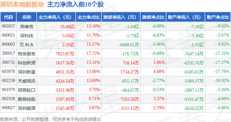从资金流向上来看,当日深圳本地股板块主力资金净流入2.31亿元,游资资金净流出4.51亿元,散户资金净流入2.21亿元。深圳本地股板块个股资金流向见下表: