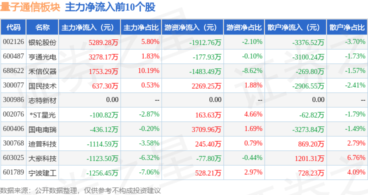 从资金流向上来看,当日量子通信板块主力资金净流出53.95亿元,游资资金净流入15.22亿元,散户资金净流入38.73亿元。量子通信板块个股资金流向见下表: