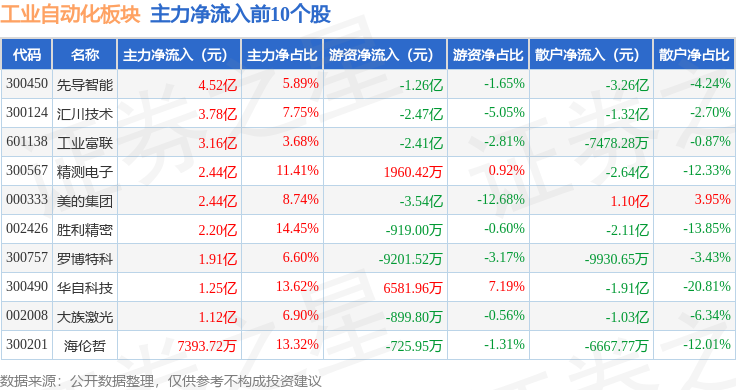 从资金流向上来看,当日工业自动化板块主力资金净流出20.52亿元,游资资金净流出5.29亿元,散户资金净流入25.8亿元。工业自动化板块个股资金流向见下表: