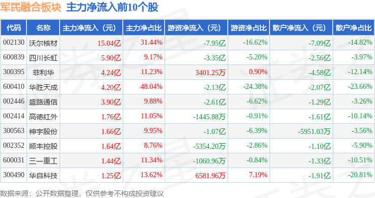 从资金流向上来看,当日军民融合板块主力资金净流出79.75亿元,游资资金净流入1.23亿元,散户资金净流入78.53亿元。军民融合板块个股资金流向见下表: