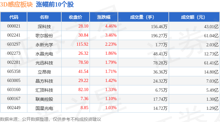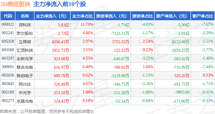 从资金流向上来看,当日3D感应板块主力资金净流入8965.94万元,游资资金净流出1.75亿元,散户资金净流入8528.46万元。3D感应板块个股资金流向见下表: