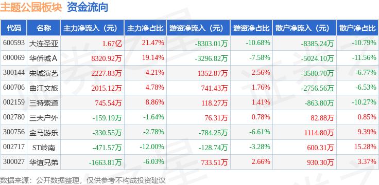从资金流向上来看,当日主题公园板块主力资金净流入2.74亿元,游资资金净流出9490.43万元,散户资金净流出1.79亿元。主题公园板块个股资金流向见下表: