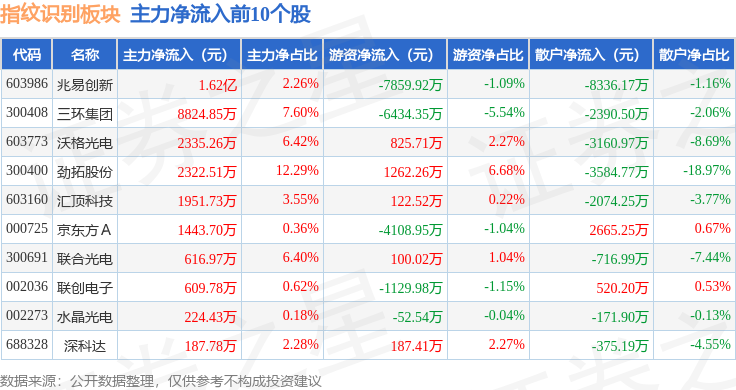 从资金流向上来看,当日指纹识别板块主力资金净流出7.9亿元,游资资金净流出6852.65万元,散户资金净流入8.58亿元。指纹识别板块个股资金流向见下表: