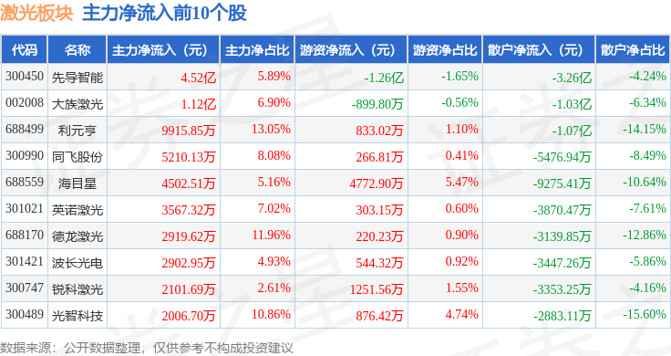 从资金流向上来看,当日激光板块主力资金净流出2.1亿元,游资资金净流入6036.37万元,散户资金净流入1.5亿元。激光板块个股资金流向见下表: