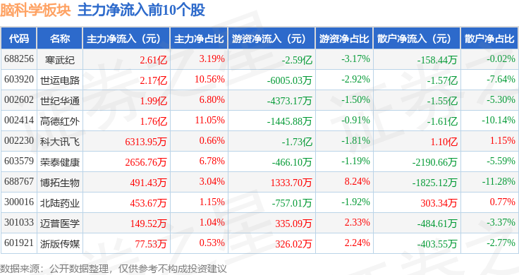 从资金流向上来看,当日脑科学板块主力资金净流出53.52亿元,游资资金净流入2203.18万元,散户资金净流入53.3亿元。脑科学板块个股资金流向见下表: