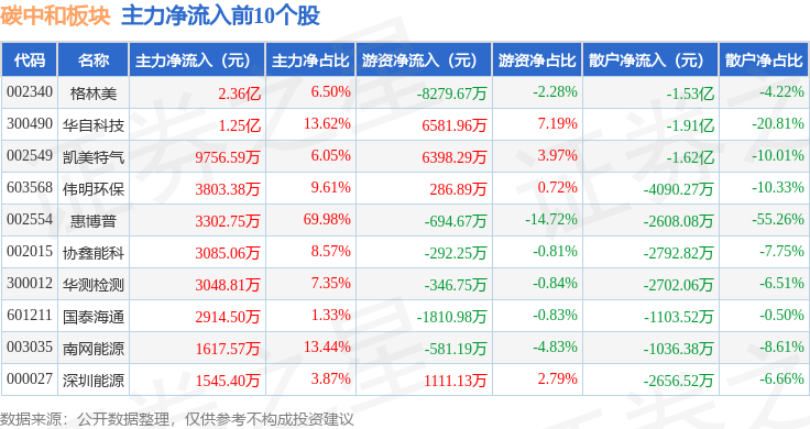 从资金流向上来看,当日碳中和板块主力资金净流出36.03亿元,游资资金净流入7.73亿元,散户资金净流入28.3亿元。碳中和板块个股资金流向见下表:
