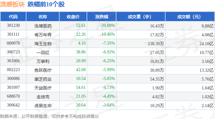 证券之星消息,1月15日流感板块较上一交易日下跌1.05%,泓博医药领跌。当日上证指数报收于4112.6,下跌0.33%。深证成指报收于14306.73,上涨0.41%。流感板块个股涨跌见下表: