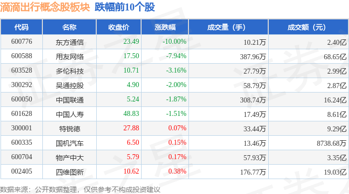 证券之星消息,1月15日滴滴出行概念股板块较上一交易日下跌1.54%,东方通信领跌。当日上证指数报收于4112.6,下跌0.33%。深证成指报收于14306.73,上涨0.41%。滴滴出行概念股板块个股涨跌见下表: