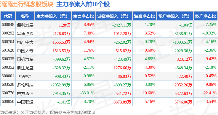 从资金流向上来看,当日滴滴出行概念股板块主力资金净流出13.58亿元,游资资金净流入2.66亿元,散户资金净流入10.91亿元。滴滴出行概念股板块个股资金流向见下表: