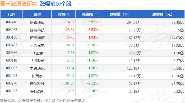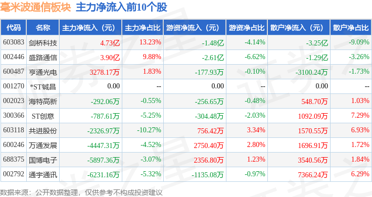 从资金流向上来看,当日毫米波通信板块主力资金净流出26.85亿元,游资资金净流入2.46亿元,散户资金净流入24.38亿元。毫米波通信板块个股资金流向见下表: