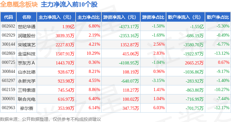 从资金流向上来看,当日全息概念板块主力资金净流出10.65亿元,游资资金净流入1.43亿元,散户资金净流入9.21亿元。全息概念板块个股资金流向见下表: