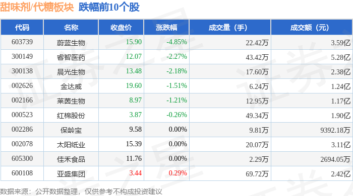 从资金流向上来看,当日甜味剂/代糖板块主力资金净流出2672.0万元,游资资金净流出825.84万元,散户资金净流入3497.84万元。甜味剂/代糖板块个股资金流向见下表: