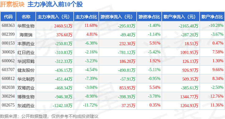 从资金流向上来看,当日肝素板块主力资金净流出1.8亿元,游资资金净流入6983.23万元,散户资金净流入1.11亿元。肝素板块个股资金流向见下表: