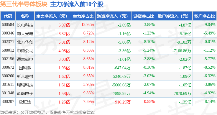 从资金流向上来看,当日第三代半导体板块主力资金净流出23.99亿元,游资资金净流出9.77亿元,散户资金净流入33.76亿元。第三代半导体板块个股资金流向见下表: