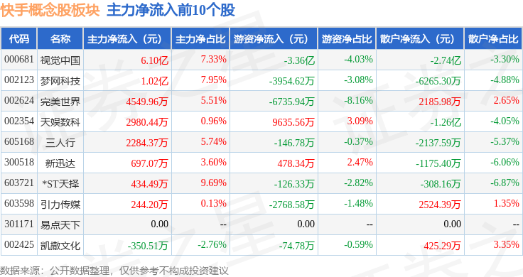 从资金流向上来看,当日快手概念股板块主力资金净流出80.43亿元,游资资金净流入8.21亿元,散户资金净流入72.22亿元。快手概念股板块个股资金流向见下表: