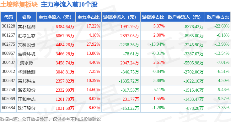 从资金流向上来看,当日土壤修复板块主力资金净流出7.44亿元,游资资金净流入9564.67万元,散户资金净流入6.48亿元。土壤修复板块个股资金流向见下表: