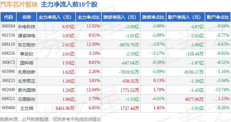 从资金流向上来看,当日汽车芯片板块主力资金净流入4.62亿元,游资资金净流出2.29亿元,散户资金净流出2.33亿元。汽车芯片板块个股资金流向见下表: