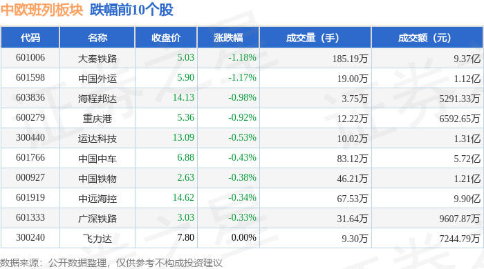 证券之星消息,1月15日中欧班列板块较上一交易日下跌0.06%,大秦铁路领跌。当日上证指数报收于4112.6,下跌0.33%。深证成指报收于14306.73,上涨0.41%。中欧班列板块个股涨跌见下表: