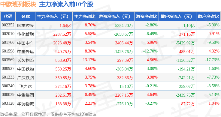 从资金流向上来看,当日中欧班列板块主力资金净流入3906.63万元,游资资金净流入1.59亿元,散户资金净流出1.98亿元。中欧班列板块个股资金流向见下表: