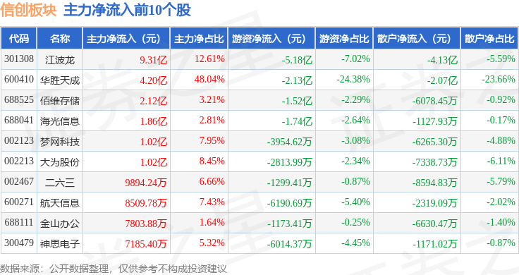 从资金流向上来看,当日信创板块主力资金净流出113.27亿元,游资资金净流入17.24亿元,散户资金净流入96.03亿元。信创板块个股资金流向见下表: