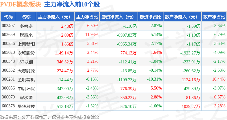 从资金流向上来看,当日PVDF概念板块主力资金净流入1.83亿元,游资资金净流出1.53亿元,散户资金净流出3043.99万元。PVDF概念板块个股资金流向见下表: