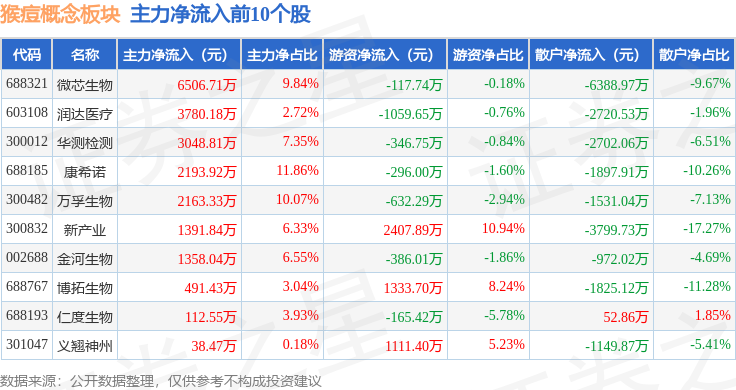 从资金流向上来看,当日猴痘概念板块主力资金净流出11.99亿元,游资资金净流入1.02亿元,散户资金净流入10.97亿元。猴痘概念板块个股资金流向见下表: