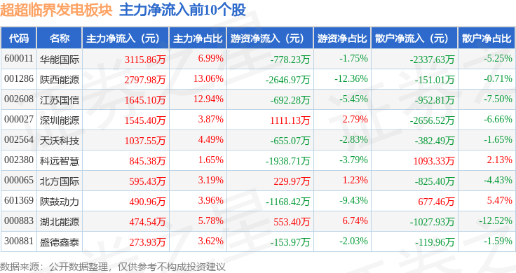 从资金流向上来看,当日超超临界发电板块主力资金净流出15.34亿元,游资资金净流入2.48亿元,散户资金净流入12.87亿元。超超临界发电板块个股资金流向见下表: