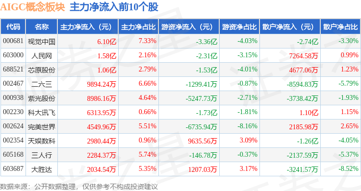 从资金流向上来看,当日AIGC概念板块主力资金净流出116.98亿元,游资资金净流入12.82亿元,散户资金净流入104.16亿元。AIGC概念板块个股资金流向见下表: