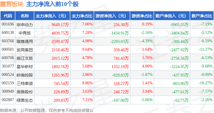 从资金流向上来看,当日露营板块主力资金净流出1122.15万元,游资资金净流入1.12亿元,散户资金净流出1.01亿元。露营板块个股资金流向见下表: