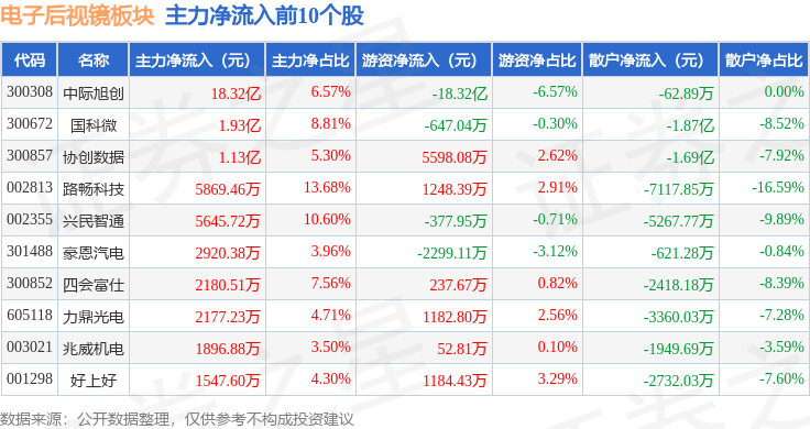 从资金流向上来看,当日电子后视镜板块主力资金净流入17.16亿元,游资资金净流出16.05亿元,散户资金净流出1.1亿元。电子后视镜板块个股资金流向见下表: