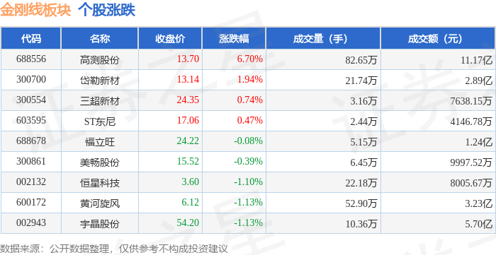 证券之星消息,1月15日金刚线板块较上一交易日上涨1.05%,高测股份领涨。当日上证指数报收于4112.6,下跌0.33%。深证成指报收于14306.73,上涨0.41%。金刚线板块个股涨跌见下表: