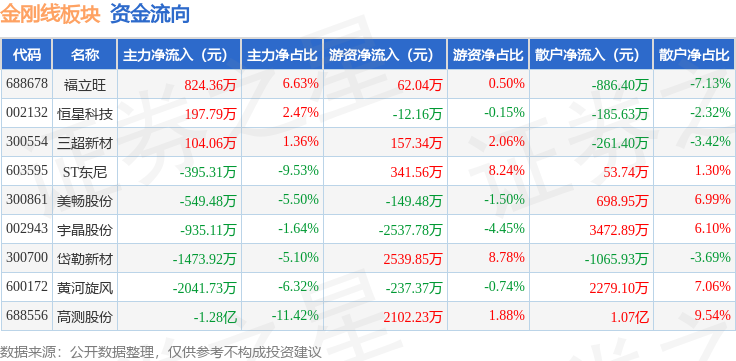 从资金流向上来看,当日金刚线板块主力资金净流出1.7亿元,游资资金净流入2266.23万元,散户资金净流入1.48亿元。金刚线板块个股资金流向见下表: